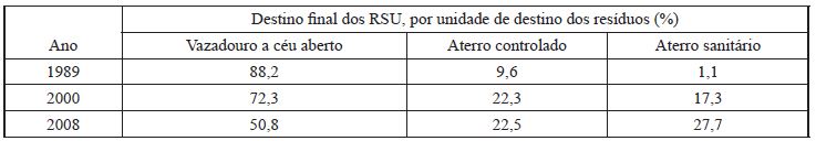 Outro aspecto relacionado ao aumento da geração dos RSU é o seu destino, já que a disposição destes de maneira a causar menor impacto negativo ao meio ambiente significa também custos financeiros relativamente mais elevados, tanto para os grandes como para os pequenos municípios. Com relação à disposição dos RSU, o IBGE (2010) apresenta na PNSB de 2010, resultados que indicam um melhoramento na forma de disposição entre os anos de 1989 e 2008, conforme indicado por Gonçalves et. all., (2013), como indicado na tabela 01: