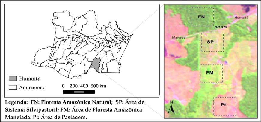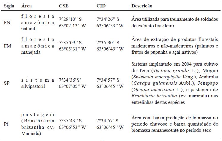 Foram utilizadas imagens do sensor Thematic Mapper (TM) do satélite Landsat 5 da órbita 232 e ponto 65 fornecidas pelo Instituto Nacional de Pesquisas Espaciais (INPE). As imagens utilizadas foram dos dias 15/07/2009, 02/07/2010 e 05/07/2011 que correspondem ao período seco da região. As quatro áreas selecionadas para estudo foram: floresta amazônica natural (FN), sistema silvipastoril (SP), floresta amazônica manejada (FM), e pastagem (Pt). Cada área de 43,61 ha (484 pixels) foi localizada com GPS Garmin II (Figura 1, Tabela 2).