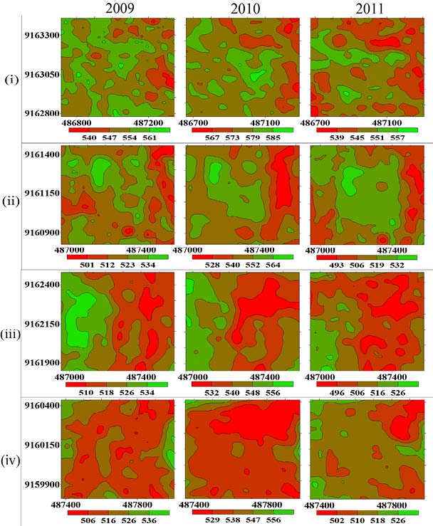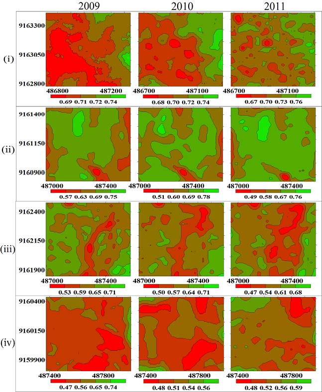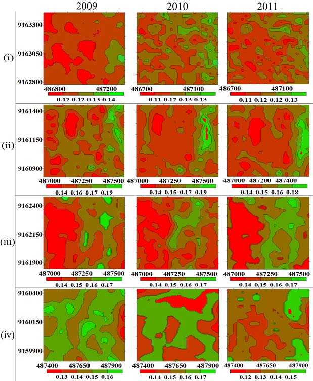 Os valores mínimos (0,61 a 0,64) e máximos (0,74 a 0,79) de NDVI de FN geram sua variação espacial ilustrada na Figura 2i. A baixa amplitude de valores não influencia os valores médios observados de 0,70 a 0,72, ratificando-os como representativos da área nos anos de 2009 a 2011. Estes valores são semelhantes aos de Gomes et al. (2013) para superfícies vegetadas. Os valores modais mostraram tendência de aumento de 0,695 em 2009 para 0,725 em 2011 e baixos desvios nos anos estudados.