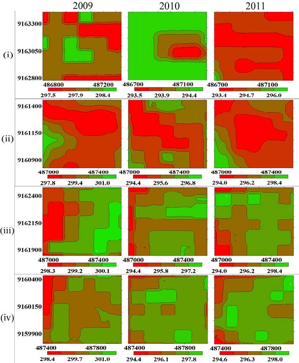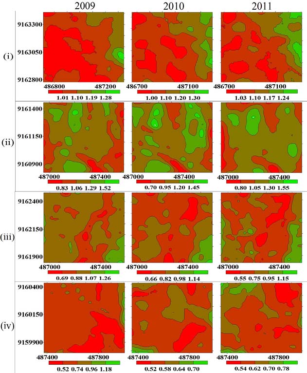 A variação espaço-temporal dos índices de área foliar (IAF) da FN encontra-se na Figura 3i. Estes valores mostraram pequena variação de 2009 a 2011, tanto nos valores mínimos de 0,76 a 0,89, quanto para os máximos de 1,48 a 1,55, relativamente entre 2009 e 2011. Tais observações são ratificadas pela similaridade entre médias (1,04 a 1,09) e modas (1,01 a 1,08) e, consequentemente, os baixos desvios observados em todos os anos.