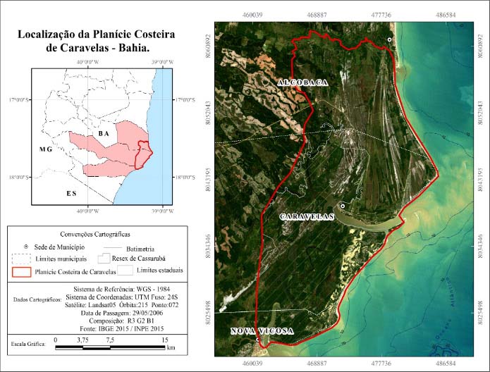 A Região Planície Costeira de Caravelas se localiza no extremo sul do estado da Bahia, na faixa costeira denominada Costa das Baleias, abrangendo parte dos municípios de Alcobaça, Caravelas e Nova Viçosa (Figura 1). Situando-se entre os paralelos 17°37’52”S e 17°51’44”S e os meridianos 39°22’7” e 39°12’7.11” W de Greenwich, esta planície se limita ao norte pela bacia do rio Itanhém, ao sul e a oeste pela bacia do rio Peruípe e a leste com o oceano Atlântico.