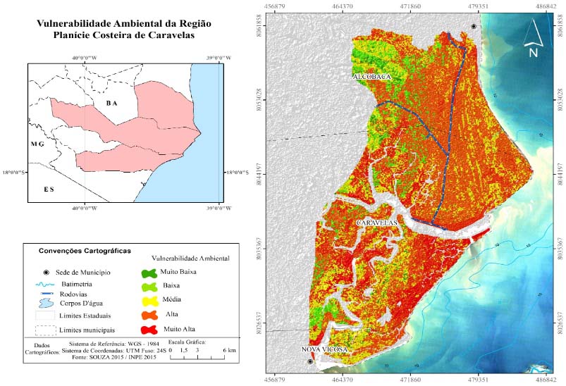 RESUMO: A pressão de uso sobre as zonas costeiras e os seus efeitos sobre o equilíbrio dos ecossistemas têm sido um assunto, frequentemente, abordado na literatura científica. Tal situação leva os planejadores a procurarem sintetizar a informação científica para desenvolver modelos de estudos costeiros integrados. A partir destes estudos, objetivar-se-á neste trabalho analisar a vulnerabilidade ambiental da Planície Costeira de Caravelas, no Estado da Bahia (Brasil), por meio de técnicas de geoprocessamento, com o intuito de subsidiar o ordenamento ambiental. Nesta pesquisa foram elaborados índices de vulnerabilidade ambiental a partir da integração das características geológicas, pedológicas, clinográficas e de uso e ocupação da terra. As classes que apresentam vulnerabilidade muito alta e alta incluem os manguezais, os ambientes flúviolagunares e a linha de costa. Na classe que apresenta vulnerabilidade ambiental média estão incluídas áreas da planície costeira e as encostas dos tabuleiros. As classes de baixa e muito baixa vulnerabilidade abrangem os topos dos tabuleiros costeiros situados no trecho noroeste da área em estudo. Os resultados encontrados permitiram a compreensão dos diferentes graus de vulnerabilidade de cada unidade frente a determinadas pressões antrópicas, podendo ser utilizado como instrumento de ordenamento ambiental local e regional.