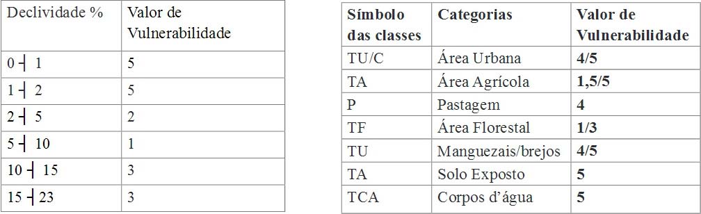 Utilizando das variáveis descritas anteriormente na Tabela 1 em formato raster procedeu-se o desenvolvimento da operação algébrica, atribuindo valores de 1 a 5 (sendo um pouco vulnerável e cinco altamente vulnerável) a cada critério e, posteriormente, somando-os, utilizando a ferramenta Reclassify e Intersect. Na sequência, para a determinação das classes de vulnerabilidade ambiental os valores atribuídos a cada classe foram interpolados, utilizando a ferramenta raster calculator. Os valores atribuídos são descritos na Tabela 02, 03, 04, e 05 e se baseiam nas pesquisas realizadas por Nascimento e Dominguez (2009), Tangliani (2002) e Crepani et al., (1996).