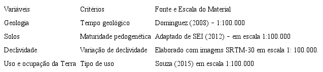 Posteriormente, seguiu-se a adaptação e/ou vetorização de algumas informações necessárias ao desenvolvimento da pesquisa, tais como o mapa geológico produzido por Dominguez (2008); o mapa pedológico elaborado pela Superintendência de Estudos Econômicos e Sociais da Bahia (SEI, 2012) e o mapa de uso e ocupação da terra elaborado por meio de classificação supervisionada híbrida de imagens LANDSAT-7 TM datadas do ano de 2011, detalhadamente exposto e descrito em Souza (2015).