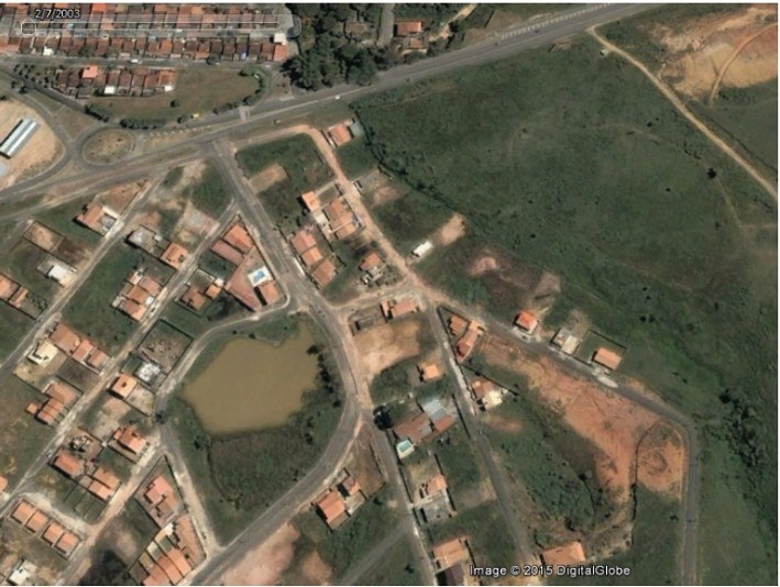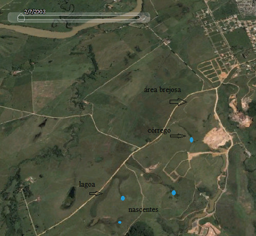No entanto, o que se nota é a total falta de comprometimento, por parte do poder público local, com a preservação dos recursos hídricos. Observa-se na Figura 02, empreendimento "A", datado da época anterior a analise do licenciamento ambiental, uma vez que o empreendimento foi aprovado em meados de 2012, que a área em questão apresenta 4 nascentes, córrego perene, lagoas naturais, área brejosa além de topo de morro que sustenta essa dinâmica hídrica.