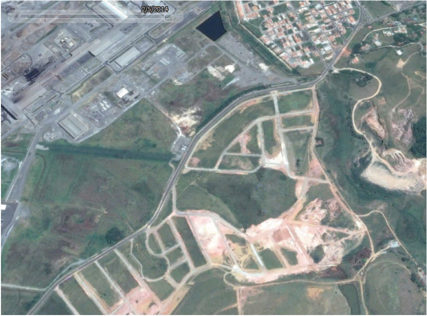 A Figura 3 demonstra que na fase de implantação do empreendimento "A" (terraplanagem) já se constata supressão das nascentes com aterro da área brejosa, além do decapeamento do topo do morro e de sua encosta.