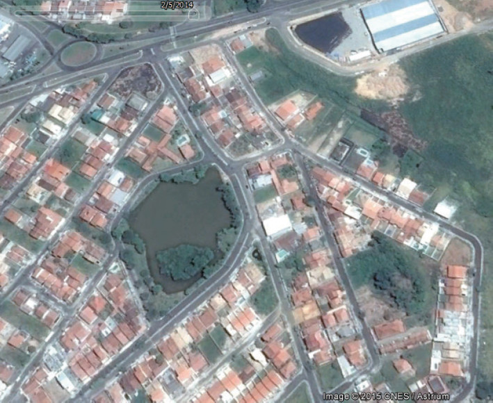 A Figura 4 evidencia construções em APP, indo de encontro à lei supracitada, no seu artigo n°4 quanto ao afastamento de 30m para os cursos d'água com até 10m de largura bem como para lagoas em áreas urbanas, fato este não respeitado ao longo do tempo, como representado na Figura 5.