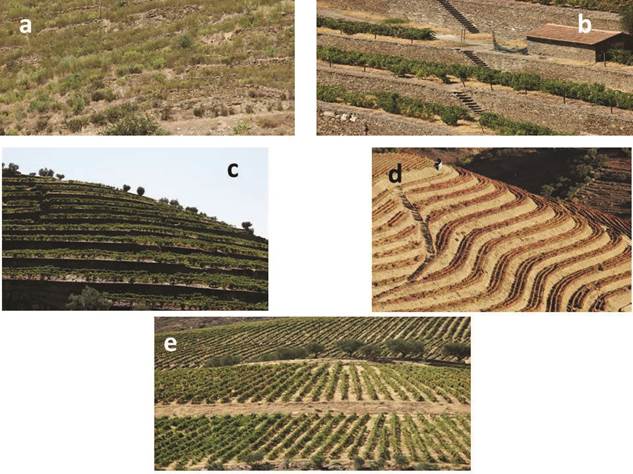 No período pré-filoxérico as vinhas eram plantadas em valeiras, em função das curvas de nível, limitadas inferiormente por pequenas paredes de xisto (Figura 2a). Normalmente estes pequenos socalcos comportavam uma ou duas fileiras de videiras que cresciam livremente, resultando numa baixa densidade de plantação. Os muros que limitavam os terraços apresentavam vantagens de redução da erosão por ação da escorrência durante o período chuvoso também facilitavam a drenagem das águas através dos espaços entre as pedras, retendo apenas a água necessária para uma regular maturação das uvas durante o período seco. No Verão, os raios solares ao serem absorvidos e refletidos pelas pedras de xisto que se encontravam na plataforma dos socalcos por um lado dificultava a perda de água por evaporação e por outro contribuíam para o processo de maturação, já que transmitiam calor às uvas (ALMEIDA, 1990). Este sistema de cultura podia ser implantado em áreas de forte declive e, apesar de alterar profundamente o perfil da vertente, não modificava excessivamente o declive geral da mesma (PEDROSA, et. al, 2004).