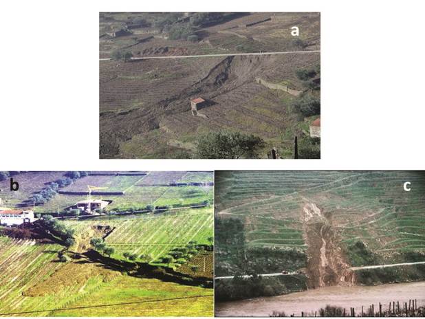 As técnicas de armação mais recentes são aquelas que trouxeram maiores problemas de erosão à RDD, tendo causado diversos dificuldades econômicas no que se refere à recuperação das áreas degradadas, assim com diversos problemas geoambientais. A construção de patamares, uma das técnicas de maior divulgação na RDD é, sem dúvida aquela que mais contribui para o surgimento de diferentes processos erosivos (PEDROSA, PEDROSA et al 2001; PEDROSA, PEDROSA et al 2004; MARTINS, 2005; MAGALHÃES, 2012). De fato, são frequentes os ravinamentos e, diversos tipos de movimentos em massa que em diversas situações colocam em risco todo o investimento que o viticultor fez para a implantação da vinha (Figura 3b).