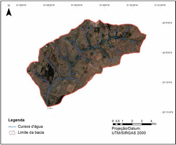 A bacia hidrográfica do córrego da Olga (Figura 2) drena área de 7,32 km2, sendo classificada como de 3ª ordem; possui 1,23 segmentos de canais fluviais por km2 (densidade hidrográfica) e 1,35 km de canais por km2 (densidade de drenagem). A área mínima necessária para a manutenção de um metro de canal (coeficiente de manutenção) de escoamento permanente é de 740,74 m2 (DIBIESO, 2007).