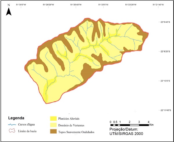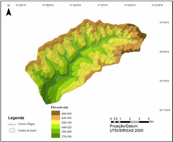 Verifica-se a predominância de maiores altitudes nos divisores ao norte e a leste da bacia, nas proximidades da nascente principal. No interior da bacia há o predomínio de um relevo ondulado, sem elevações consideráveis, com os menores valores encontrados nas proximidades da foz.