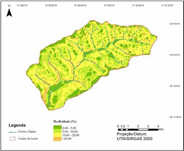 A declividade é fator essencial no planejamento, pois a partir das características de inclinação do relevo é que se determinam as atividades a serem realizadas na bacia. Além disso, áreas com declividade superiores a 45º são consideradas áreas de preservação permanente, segundo o Código Florestal. Outro fator é que com o aumento da declividade da superfície do solo a suscetibilidade à erosão aumenta, sendo necessária uma maior atenção para áreas com maior declividade e sem cobertura vegetal. Assim, a geração do mapa de declividade levou em consideração os seguintes intervalos (DE BIASI, 1970): (a) < 5%: áreas quase planas, adequadas ao uso e ocupação do solo (no caso de vertentes e/ou topos), ou inadequadas (no caso de planícies fluviais, pelos riscos de inundação e por estarem em área de preservação permanente; (b) 5 a 10%: áreas com moderada suscetibilidade à erosão, com poucas restrições ao uso e ocupação do solo; (c) 10 a 20%: áreas com forte suscetibilidade à erosão, necessitando de adequado manejo para sua utilização; (d) > 20%: áreas com escoamento superficial muito rápido e muito forte suscetibilidade à erosão. O limite de 20% é definido por legislação municipal (Lei complementar nº. 127/2003), como limite máximo para urbanização sem restrição, a partir do qual todo e qualquer parcelamento far-se-á através de exigências específicas.