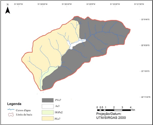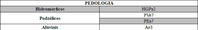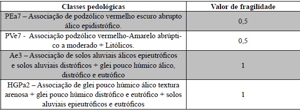 Na bacia hidrográfica em questão encontram-se os solos hidromórficos, aluviais e podzólicos. Os dois primeiros, segundo Crepani et al. (2001), se caracterizam por serem solos jovens ou pouco desenvolvidos, isto é, sua principal característica é a pouca evolução dos perfis de solo, são então classificados em altamente frágeis (valores próximos a 1). Os solos podzólicos, ocorrem em topografias levemente acidentadas, nestes solos geralmente ocorre acumulação de argila no horizonte B, translocada do horizonte A. Esta diferença de textura dificulta a infiltração de água no perfil, o que favorece o processo de erosão. Portanto, tais solos são considerados moderadamente frágeis, com valores em torno de 0,5. Os valores de fragilidade atribuídos a cada tipo de solo encontrado na bacia hidrográfica são apresentados na Tabela 1.