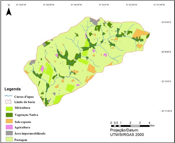 A representação vetorial das classes de uso e ocupação da terra (Figura 9) foi obtida através de vetorização manual, tendo como base a imagem Alos/Avenir 02 a partir de uma cena datada de fevereiro de 2009, com resolução espacial de 10 metros e com atualização através de trabalhos de campo. As classes de cobertura definidas foram: pastagem, agricultura, silvicultura, vegetação nativa, área impermeabilizada e solo exposto.