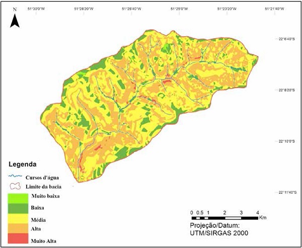 Em relação aos valores atribuídos ao grau de vulnerabilidade das vertentes, segundo Cunico (2008) diversas pesquisas estabelecem que as vertentes de perfil côncavo são mais propensas a ocorrência de deslizamento, processos erosivos e até mesmo ravinamento e voçorocas, em razão da convergência de fluxo de água. Como na bacia em estudo há o predomínio de ambos os tipos de vertentes, agrupadas no mesmo compartimento geomorfológico (domínio das vertentes convexo-côncavas), foi utilizado o valor 0,5 para tal compartimento.