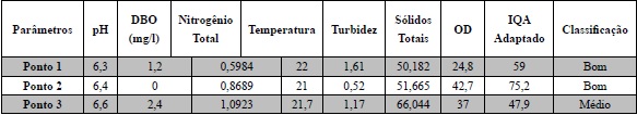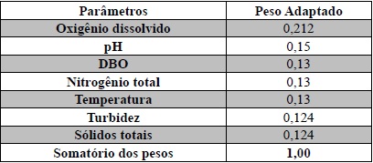 A caracterização da qualidade da água foi realizada através de análises físico-químicas de amostras de água coletada em três pontos do leito principal e foi calculado o índice de qualidade de água (IQA) adaptado para cada ponto de amostragem. No cálculo do IQA são utilizados nove parâmetros de qualidade devidamente ponderados, sendo eles oxigênio dissolvido, coliformes termotolerantes, pH, DBO, nitrogênio total, fósforo total, temperatura, turbidez e sólidos totais. Neste trabalho foi criado um índice adaptado baseado em sete parâmetros, onde foram definidos novos pesos para cada uma das variáveis. Para determinação destes novos pesos, excluiu-se o parâmetro coliformes termotolerantes e fósforo total e manteve-se a importância relativa dos pesos originais, normalizando-se os valores de modo que o somatório dos parâmetros fosse igual a 1,00. Os novos pesos calculados são apresentados na Tabela 6.