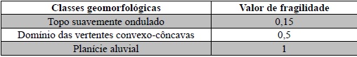 A carta Geomorfologica que apresenta três compartimentos geomorfológicos principais: áreas de topo suavemente ondulado, domínio das vertentes convexo-côncavas e áreas de planície aluvial, foi ponderada segundo caracterização dos trabalhos de Crepani et al. (2001) e Cunico (2008). Para os topos suavemente ondulados foi atribuído peso 0,15, pois segundo Crepani et al. (2001), relevos planos a suavemente ondulados, como as colinas de topos aplainados apresentam valores de fragilidade baixa, indicando maior estabilidade destas áreas.