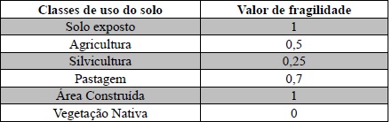 O principal parâmetro utilizado para definir os valores de fragilidade das classes de uso e ocupação da terra foi densidade de cobertura vegetal, organizado por Ross (1994), obedecendo uma ordem decrescente da capacidade de proteção, como mostra a Tabela 4.