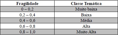 Depois de definidos os valores de fragilidade para cada uma das classes dos mapas a serem integrados procedeu-se calculando a média simples, pois considerou-se que todos as cartas (geomorfologia, declividade, pedologia e uso e ocupação da terra) tem pesos iguais na vulnerabilidade à erosão. Como resultado da operação citada acima, foi gerada uma grade de fragilidade no intervalo [0, 1]. Em seguida, tal modelo foi fatiado de acordo com as classes temáticas apresentadas na Tabela 5.