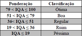 Para o cálculo do IQA foram utilizadas as curvas de variação da qualidade da água de acordo com o estado ou condição de cada parâmetro (CETESB, 2006). A qualidade da água foi determinada a partir da ponderação obtida, utilizou-se a classificação proposta pela CETESB (2006), conforme apresentado na Tabela 7.