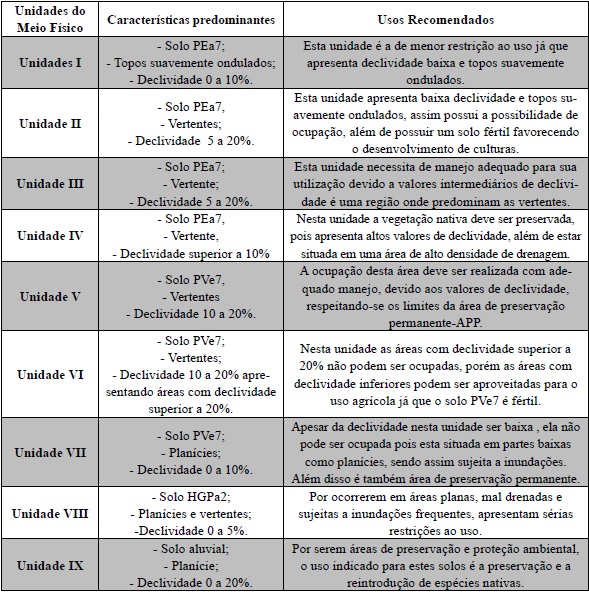 As unidades do meio físico são consideradas segundo Dibieso (2007), como áreas que apresentam relativa homogeneidade nos seus fatores naturais, atributos, funções, aptidão para determinada forma de uso e ocupação e respostas semelhantes para as ações antrópicas. A Figura 8 apresenta as unidades do meio físico encontradas na bacia hidrográfica do córrego da Olga e a Tabela 9 apresenta o uso recomendado para cada unidade.
