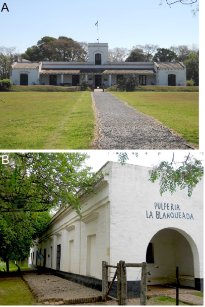 En segundo lugar, destacamos al hermano del escritor, Antonio Güiraldes (1887-1947), quien se desempeñó como político en San Antonio de Areco, ocupando diversos cargos, entre ellos Intendente. En una de sus gestiones organizó una muestra de artesanías “tradicionales” en 1936; diez años después de la publicación del Don Segundo Sombra. Este evento impulsó la creación del Parque Criollo, y dentro de ese predio, la construcción del Museo Gauchesco “Ricardo Güiraldes” (1938), en un contexto político muy favorable, ya que a nivel nacional y provincial se promovían espacios que exaltaran y resguardaran símbolos icónicos del país (BÉJAR, 1992). Los objetivos del Parque y Museo eran, por una parte, homenajear la figura del “gaucho” y del escritor Ricardo Güiraldes, exhibir y preservar elementos asociados a la tradición nacional. Por otra, constituirse como el destino turístico de la ciudad. El mismo fue construido en una propiedad que se compró especialmente para edificar y simular una estancia típica de la campaña bonaerense del siglo XIX (LECOT, 1967; Figura 03A), pasando el Puente Viejo de la ciudad, donde además se encontraba la pulpería La Blanqueda (Figura 03B); permitiendo materializar la narrativa del libro Don Segundo Sombra: