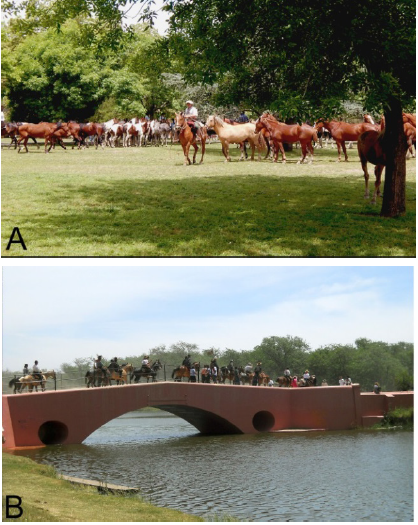 La estilización del CH de San Antonio de Areco también tuvo fines económicos al conformarlo como el lugar turístico de la ciudad y partido. Así, en la década de 1970 además de fomentar su embellecimiento, el gobierno municipal impulsó la creación de atractivos y actividades asociados a la tradición (Ordenanza 1830/1996; Ordenanza 2027/1998); además de promover el establecimiento de servicios de alojamiento y gastronomía (Ordenanza 852/1988, 1247/1991, 1496/1994; 1505/1994, 1701/1995) dentro del CH; y la capacitación de guías. En este marco, la Fiesta de la Tradición se configuró como el atractivo más importante de la ciudad, a partir de su espectacularización, promovida por el Comodoro Güiraldes (PÉREZ WINTER, 2016). El Comodoro Güiraldes también creó la exposición de los artesanos (1971) como un atractivo adicional. A su vez, las estancias comenzaron a abrirse al turismo ofreciendo diversos servicios y shows “campestres”. Asimismo, el gobierno municipal promovió acciones que permitieran recrear y/o evocar el Don Segundo Sombra en la ciudad, y difundir los “usos y costumbres”, exaltando el paisaje pampeano ganadero, carente de alambrados, como el ámbito del “gaucho”. Ese tipo de paisaje se configura especialmente el día que se realizan el desfile en el marco de la Fiesta de la Tradición. Allí es cuando el “pueblo” y el área de la costanera de la ciudad se llena de caballos y “gauchos” (Figura 4 A), que luego atraviesan el Puente Viejo para trasladarse al Parque Criollo (Figura 4 B).