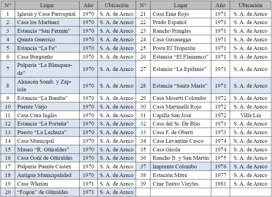 De esta forma, la Junta comenzó a seleccionar, jerarquizar y preservar edificaciones aisladas con características “vernáculas”, que posean “arquitectura ceñida al estilo tradicional de la región” bajo la declaratoria “Lugar Significativo”. En los años 1970-1977, otorgó ese reconocimiento a 38 inmuebles (Tabla 1); la mayoría localizados en el CH de la ciudad, (donde anteriormente se habían ubicado los primeros solares-Figura 02), pertenecientes a personalidades destacadas de la elite local; a excepción de dos pulperías que representarían espacios populares de sociabilidad. De las 39 propiedades reconocidas durante la gestión 1970-1981 (Tabla 01, resaltado en celeste), 15 se vinculan a la familia Güiraldes o a los lugares que se mencionan en la obra de R. Güiraldes (PÉREZ WINTER, 2016). Los criterios establecidos por la Junta, en su primer periodo de actuación (1970- 1981), evocaron y activaron la tradición “surera” a partir de valorizar ciertos lugares. Y, hasta el día de hoy, las declaratorias de “Lugar Significativo” se anuncian anualmente el domingo que se realiza el desfile en el marco de la Fiesta de la Tradición.