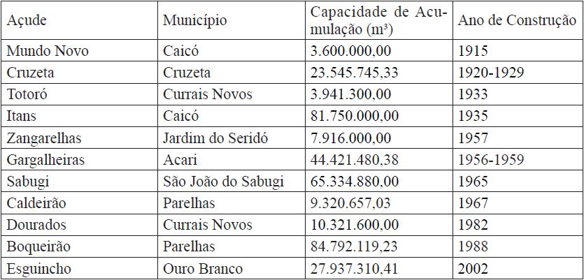 É deste modo que a açudagem oferece, então, uma importante base de suporte para outras formas de organização, usos e possibilidades sociais. Esses objetos se apresentam como verdadeiras rugosidades no espaço que, integrados ao sistema social, sofrem consideráveis mudanças de suas funções e de seus valores. Santos (1992) ressalta ser esse um contexto que se perfaz a partir de formas provenientes de tempos distintos (rugosidades). O problema consiste, portanto, conforme acrescenta o referido autor (op cit, 1988b) em reconhecer o efeito dessas superposições sobre a existência de cada sociedade. Na região do Seridó, a evolução da açudagem pode ser melhor observada na tabela a seguir (ver tabela 1):