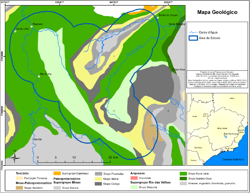 A área de estudo possui predominância das rochas do SGRV e SGM, como demonstrado na figura 01. As cristas do sinclinal são compostas por rochas do SGM e seus grupos Itabira e Caraça. As rochas do Grupo Itabira possuem grande representatividade do itabirito, rico em óxido de ferro, já as rochas do Grupo Caraça contêm como maior representante os quartzitos, sobretudo a oeste, em direção à sede municipal de Rio Acima. No entanto, no interior do sinclinal existem áreas deprimidas em relação às cristas serranas.