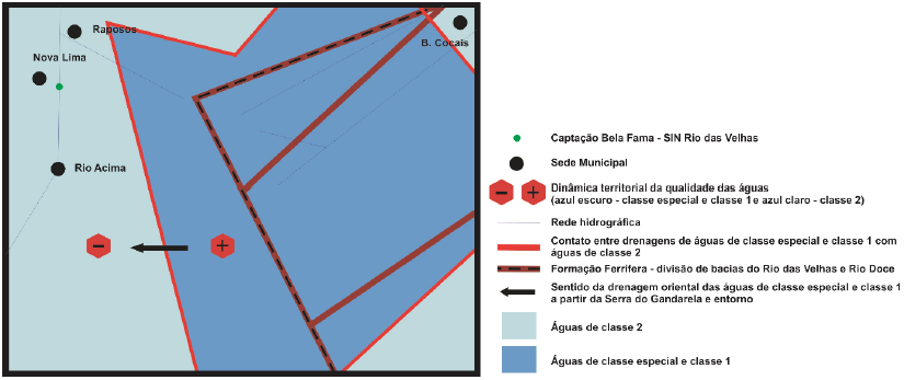 A partir do modelo gráfico apresentado na figura 02, percebe-se que as águas classificadas em especial e classe 1 se concentram ao redor do divisor de bacias representado pela Serra do Gandarela e adjacências. Os afluentes provenientes dessa serra contribuem com a qualidade e quantidade da água captada em Bela Fama e distribuída para a RMBH. Essa contribuição é sinalizada pelas polaridades positiva (+) e negativa (-). Nesse corema se evidencia o caráter insular da serra quanto às águas de classes especial e 1, circundada que está pelo entorno cujas águas revelam crescente deterioração (classe 2 e, mais distalmente, classe 3).