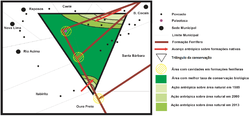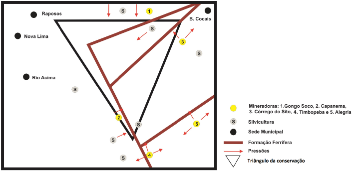 A zona com menor influência antrópica foi representada no corema da figura 03 por recorte que assume geometria triangular. Esse recorte é aqui denominado triângulo da conservação e abrange territórios dos municípios de Caeté, Barão de Cocais, Santa Bárbara, Ouro Preto, Itabirito, Rio Acima e Raposos. A sua delimitação priorizou as formações vegetais arbóreas, a exemplo da Mata Atlântica, como também as formações arbustivas do Cerrado e Campos Rupestres. Todavia, o triângulo não inclui somente formações nativas, pois há nele pequenos enclaves de plantações de subsistência e mesmo de eucalipto.