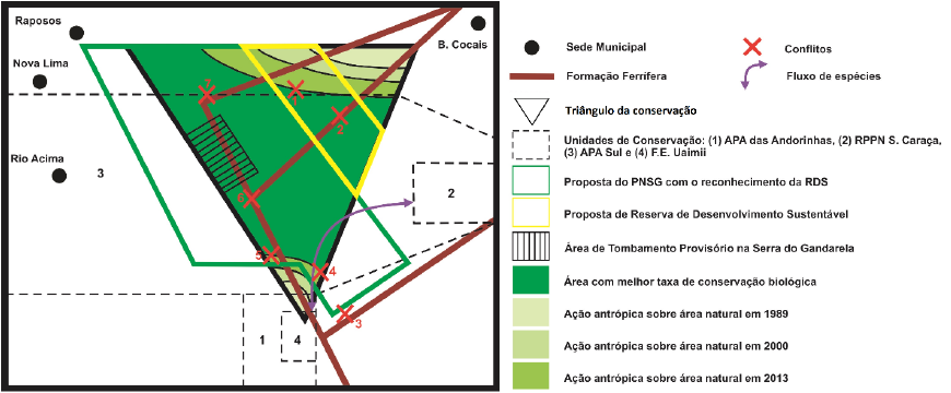 No corema da figura 5, pode-se verificar o avanço das mineradoras e da silvicultura sobre o triângulo da conservação, notadamente a sul e a nordeste da Serra do Gandarela, com forte impacto na redução dos biomas locais. Em consequência desse fato, já se observa comprometimento no fluxo das espécies entre as unidades de conservação, sobretudo na porção sudeste da área investigada, em razão da intensificação do antropismo nos corredores ecológicos entre a RPPN Santuário do Caraça e a Floresta Estadual do Uaimi.
