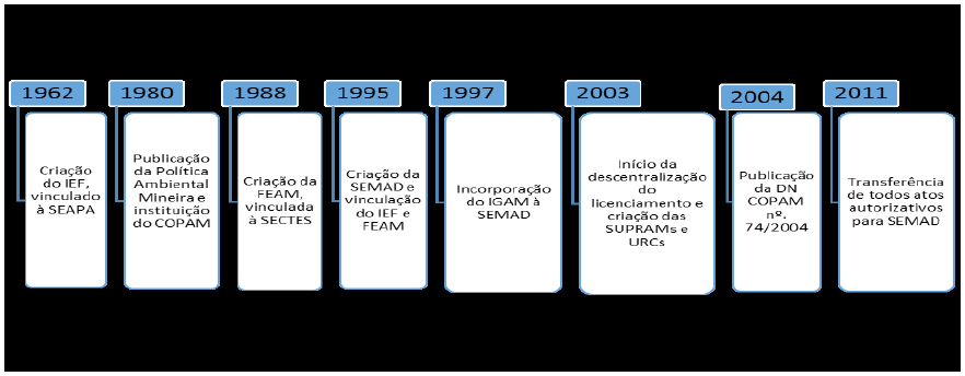 Cada partícipe do SISEMA teve suas atribuições reformuladas em 2011, com a promulgação da Lei Delegada 180 (MINAS GERAIS, 2011), e todo o processo de licenciamento ambiental e demais atos autorizativos passaram a ser de competência da SEMAD, através das SUPRAM’s, atualmente denominadas Superintendências Regionais de Regularização Ambiental, que são nove em todo o Estado, distribuídas por região demográfica e estão subordinadas à Subsecretaria de Gestão e Regularização Ambiental. A figura 01, demonstra a cronologia com os principais eventos de estruturação do licenciamento ambiental mineiro até 2011: