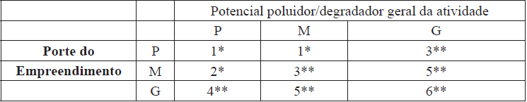 O tipo de processo de regularização ambiental é definido com base nesta classificação e pode ser dividido em três formas distintas: dispensado de licenciamento ou autorização ambiental de funcionamento, sujeito a autorização ambiental de funcionamento (Classes 1 e 2) ou sujeito ao licenciamento ambiental (Classes 3 a 6), conforme tabela a seguir: