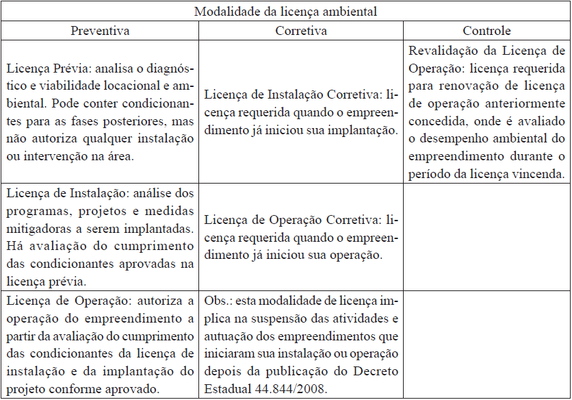 No processo de licenciamento ambiental, foco deste estudo, a natureza das licenças ambientais pode ser considerada como preventiva, corretiva ou de controle, conforme Tabela 2. Embora na legislação federal exista somente a previsão das licenças preventivas, na legislação estadual é possível encontrar as licenças de natureza corretiva e de controle.