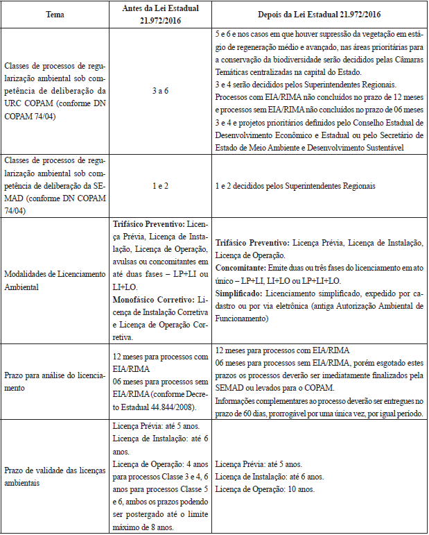 Gradativamente, após a publicação da Lei Estadual 21.972/2016, foram promulgados vários decretos regulamentadores ou auxiliares, que transformaram o ordenamento legal e estrutural da SEMAD em colcha de retalhos. Há pelo menos 06 decretos de relevância para a questão ambiental em Minas Gerais, a saber: Decreto Estadual 46.937/016, 46.953/2016, 46.973/2016, 47.042/2016, 47.134/2017 e 47.137/2017, que juntos resguardam as principais mudanças no rito processual da regularização ambiental, conforme demonstrado na Tabela 03.