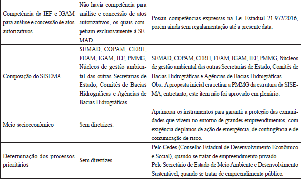 A mudança mais significativa dentro deste novo contexto, no que se refere ao modelo mineiro é a retirada gradativa dos processos de licenciamento da apreciação das Unidades Regionais do COPAM, levando os julgamentos de maior porte ou potencial poluidor para julgamento centralizado em Câmaras Técnicas Especializadas. O IEF e o IGAM voltam a ter competência de analisar e decidir atos autorizativos, embora tal decisão ainda esteja sem regulamentação. Os prazos de vigência das licenças ambientais foram padronizados com a legislação federal, sendo a Licença Prévia válida por 5 anos e a Licença de Operação por 10 anos. Ainda, os órgãos intervenientes terão 120 dias para se manifestar no processo de licenciamento, sem prejuízo da decisão final, embora a licença só tenha efeitos após as manifestações necessárias. Outra mudança proposta, mas não aceita pelo plenário da Assembleia era a retirada da Polícia Militar de Minas Gerais do Meio Ambiente da constituição do SISEMA. No texto final, a PMMG Meio Ambiente figura como parte integrante do SISEMA.