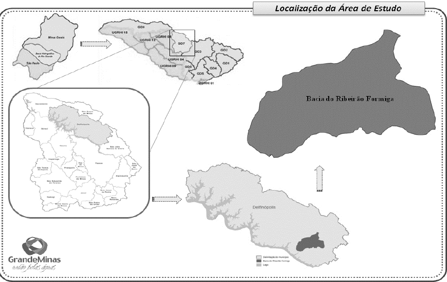 Este trabalho foi desenvolvido na sub-bacia Hidrográfica do Ribeirão Formiga, inserida na Bacia Hidrográfica dos Afluentes Mineiros do Médio Rio Grande (CBH-GD7), que apresenta uma área aproximada de 9.800km2 e engloba 22 municípios, dentre eles Delfinópolis (Figura 1). O Ribeirão Formiga, tem suas nascentes em uma área não Regularizada do Parque Nacional da Serra da Canastra e fornece água para o abastecimento público do Distrito da Babilônia, para irrigação da agricultura local e para a dessedentação de animais.