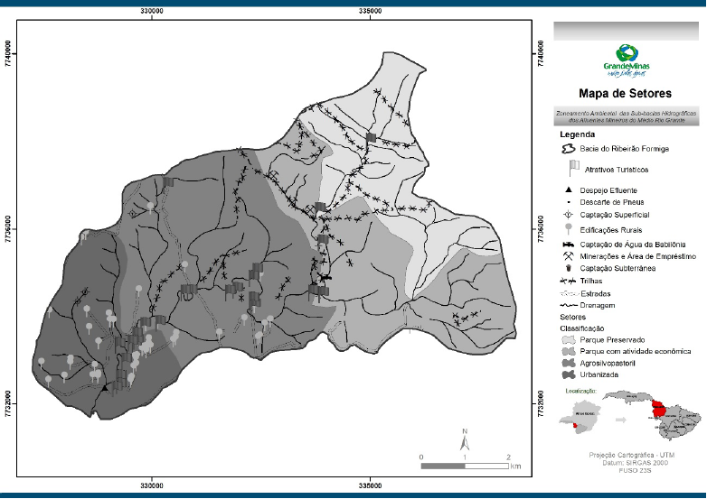 A Bacia do Ribeirão Formiga é uma Unidade Ambiental (UA) dentro do Projeto Grande Minas. Neste trabalho ela foi setorizada orientando-se pela distribuição da bacia hidrográfica e de acordo com as características do relevo, porém, outros fatores foram considerados para que a setorização desta UA ocorresse desta forma: