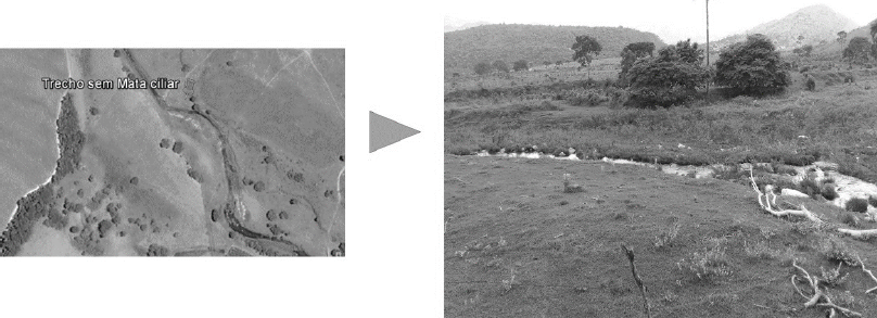 A maior parte das Áreas de Preservação Permanentes (APPs) estão protegidas com vegetação nativa, entretanto, em alguns afluentes do Ribeirão Formiga é possível notar vários trechos sem mata ciliar. Nota-se na Figura 4, em uma visita de campo realizada na área de estudo, a mata ciliar inexistente; a área é usada para pastagens e para dessedentação e travessia de animais.