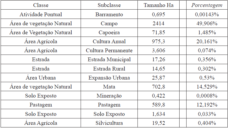 A ocupação do solo próximo a área urbana é predominantemente formada por pastagens e culturas anuais e estão entre os principais cultivos: cana-de-açúcar, milho, soja e feijão. Entre os dois tipos de uso principais do solo citados acima, a silvicultura aparece em alguns pontos, caracterizados pelo cultivo de eucalipto. Em seguida destaca-se a presença de culturas permanentes, representadas pelo cultivo principalmente de bananas e em menor extensão por café. A Tabela 1 mostra o tamanho em ha e a porcentagem das subclasses dentro da área de estudo.