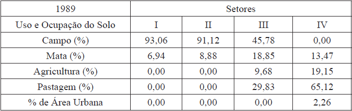 A análise das imagens de 1989 foi utilizada para se realizar um levantamento dentro da área de estudo, no que se refere ao uso e ocupação do solo quanto: agricultura (culturas anuais, culturas permanentes e silvicultura), pastagem, área de campo (campo limpo e campo arbustivo), mata e área urbana, e gerou um mapa de uso e ocupação destes itens.