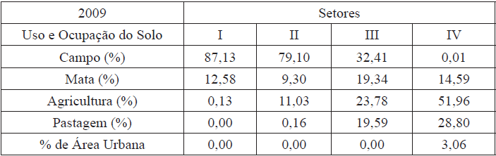 A Figura 5 mostra a divisão da Bacia em setores; a Tabela 2 mostra os resultados encontrados, por setor, com a ajuda do levantamento realizado com as imagens do ano de 1989. A Tabela 3, mostra a análise de uso e ocupação nas imagens de 2009, por setor, adaptado do Projeto Grande Minas.