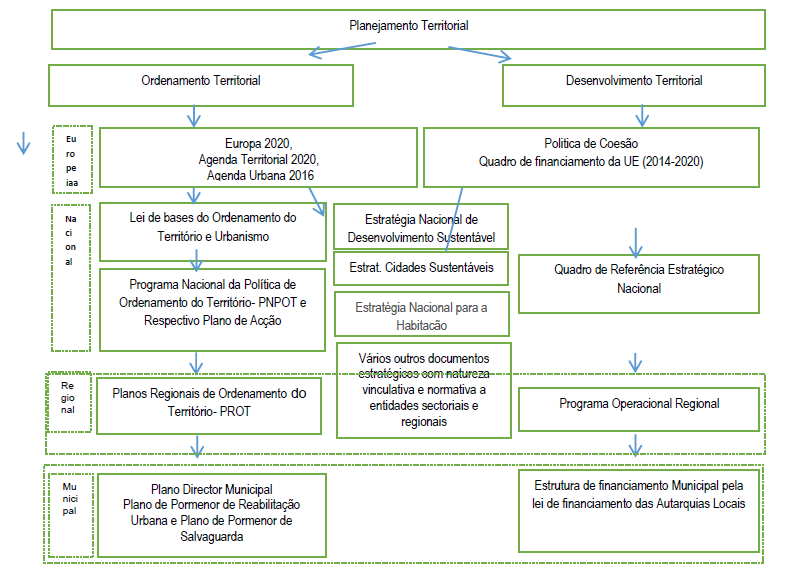 Tomemos como ponto de partida alguns instrumentos de política portuguesa. A Figura 2 retrata de forma muito sintética a organização dos instrumentos em Portugal que traduzem uma visão complementar do planejamento: as estratégias de ordenamento territorial e as estratégias mais dirigidas para objetivos de desenvolvimento regional.