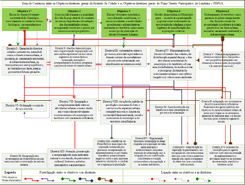 Percebemos que a política pública urbana ganha relevância e constitui-se em responsabilidade do poder municipal via as medidas legais estabelecidas no Estatuto da Cidade. Para apreender a ligação entre essa lei e a lei local, apresenta-se a Figura 4. Observamos que, das 16 diretrizes gerais que preconiza a Lei federal, todas de certa forma possuem ligação com os objetivos gerais do PDPML, com destaque para a primeira diretriz, que tem ligação com quatro dos cinco objetivos do PDPML. Tendo isso em vista, podemos afirmar que o grau de coerência entre ambas as leis existe com alguma expressão.