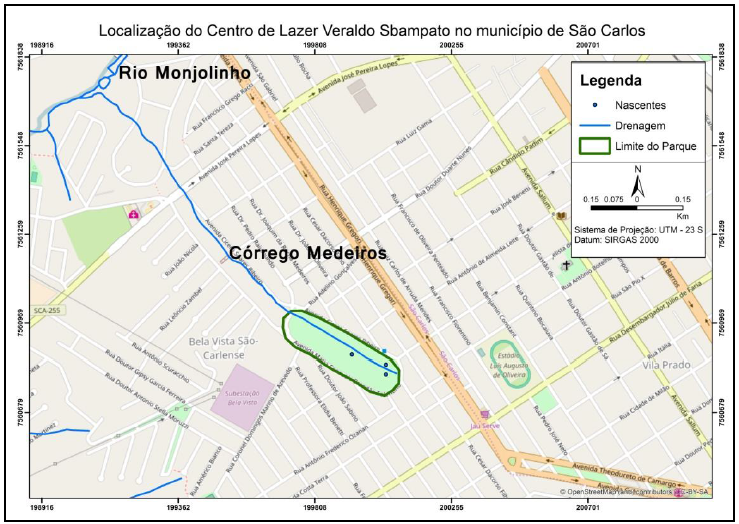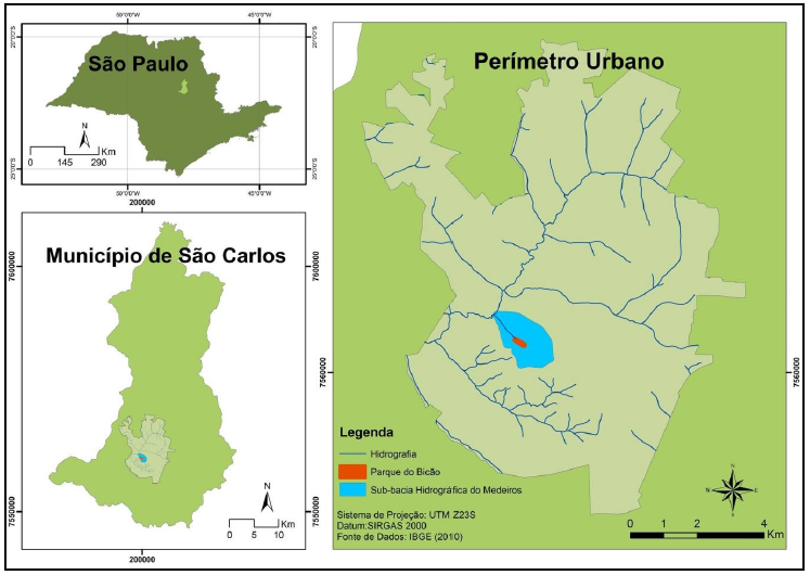 O município de São Carlos está localizado no centro geográfico do estado de São Paulo, a 238 km da capital, entre as coordenadas 21°36’ - 22°10’ S e 47°43’ - 48°06’ W. (Figura 1). Segundo o Instituto Brasileiro de Geografia e Estatística - IBGE (2016) possui área territorial de 1.136,907 km² e população estimada para o ano de 2017 em 246.088 habitantes. A microbacia do Medeiros é uma bacia urbana, inserida na bacia hidrográfica do rio Monjolinho, pertencente à Unidade de Gerenciamento de Recursos Hídricos Tietê-Jacaré (TOYAMA et al., 2015). Essa bacia está localizada na zona Sul do município, porção Sudoeste da área urbana e, em sua porção média, localiza-se o Parque do Bicão. Dentro dos seus limites há três importantes nascentes que formam o córrego Medeiros e que deram nome popular ao parque construído em 1982, com área de 41.800 m² (PREFEITURA MUNICIPAL DE SÃO CARLOS, 2008), localizado no bairro Bela Vista São-Carlense. A Figura 2 apresenta a localização do parque na área urbana da cidade.