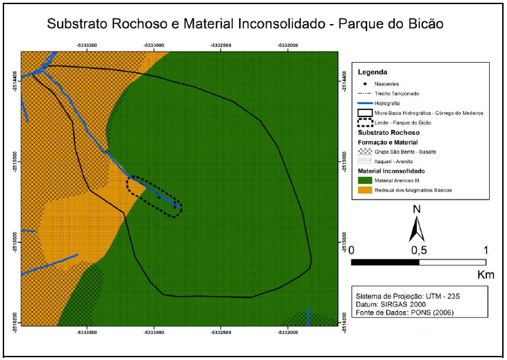 Esta transição entre materiais arenosos sobre materiais menos permeáveis, com fluxo lateral de água subterrânea também favorece a ocorrência de focos erosivos quando o equilíbrio é rompido pela retirada de vegetação e/ou usos inadequados com concentração de água, também contribuindo a declividade mais acentuada que favorece o escoamento superficial (PONS, 2006). Provavelmente foram estes os processos que geraram a antiga erosão da área, hoje reabilitada pelo parque.