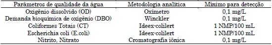 Para a avaliação qualitativa e quantitativa das águas foram realizadas 34 campanhas, em tempo seco, no período de 31/01/2013 a 31/03/2014, salienta-se que destas 34 campanhas, em 17 campanhas houve a avaliação de nitrito e nitrato. O ponto de amostragem para o monitoramento da qualidade da água está junto à estação fluviométrica Cancela-Tamandaí. Os parâmetros de qualidade da água avaliados, metodologia utilizada e limite de detecção estão descritos, resumidamente, na Tabela 1. A metodologia utilizada para as análises seguiu a descrita no Standard Methods for the Examination of the water and wastewater (APHA, AWWA, WPCF, 2012).