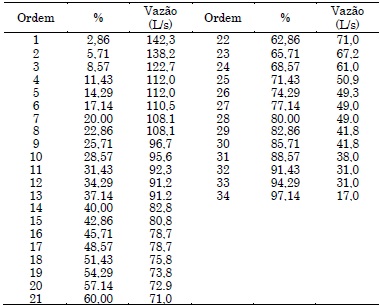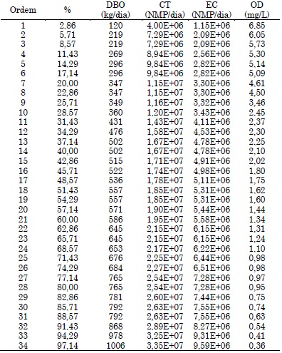 As curvas de probabilidade foram construídas para as seguintes variáveis de qualidade da água: DBO e CT, E. coli e OD, nitrito e nitrato. Para a elaboração das curvas de probabilidade os valores de cada variável foram ordenandos de forma crescente, mantendo suas cargas correspondentes associados à frequência de excedência, conforme tabelas 2 e 3.
